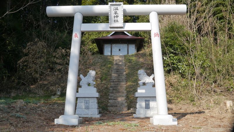 野崎村大字豊田字湯泉鎭座 村社 湯泉神社 祭神 大巳貴命 少彦名命 祭日陰暦九月十九日 建物本社間口九尺四方栃葺 拜殿間口三間奥行二間萱葺 木鳥居一基 氏子七十戸總代四員關谷伊佐次仝文彌君島常三郎 社掌關谷喜一郎仝村仝大字住