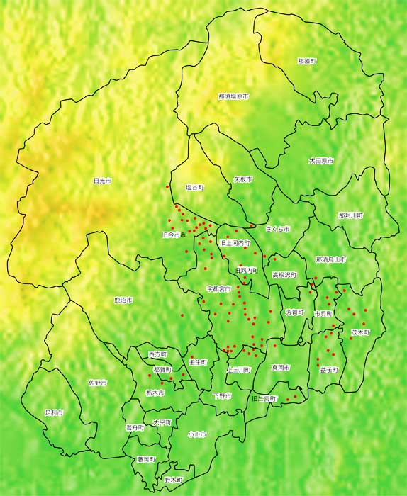 もちろん八幡宮,星宮,八坂,稲荷,愛宕など栃木県内多数派の神社とともに古墳の分布と重なってくる。栃木県を大きく二分した那珂川上流の那須国にはいまのところ高龗神社は見つからない。下毛野国の地に高龗神社は集中する。温泉,温泉神社が集中する那須郡と河内・芳賀郡は異なる文化圏を形成しているのである。